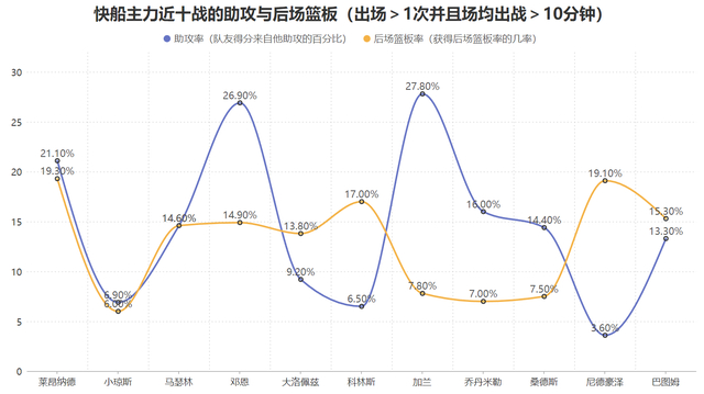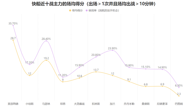 第一要素是部分球员填补了离队带来的缺失,哈登离队对快船最大的影响是持球单打与梳理进攻的损失,但马瑟林的加盟扛起了快船的大量得分任务,他虽然得分效率不高但产量足够高近十战的使用率达到了28.4%场均得分也达到了19.2分;