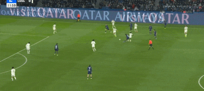 巴黎在中路连续传球,埃杜分球,登贝莱带球杀到禁区里。此时,对方禁区里只有登贝莱一个巴黎球员。面对里尔的4名后卫,登贝莱一点不慌,横向拉球,连续2个横向拉球,戏耍了他们的整条防线。